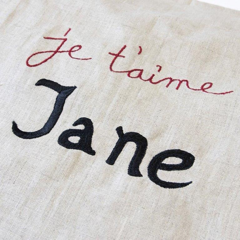 ナチュラルカラーの麻の生地に手仕事で刺繍のワードを施したショルダーバッグは、シンプルなデザインながら使い勝手が良く容量も限度を越えなければ十分なサイズを持ち合わせています。